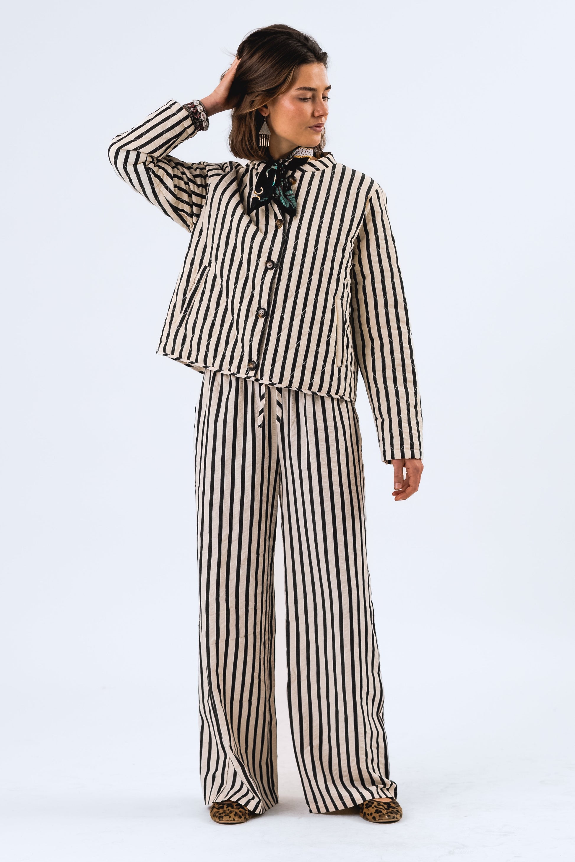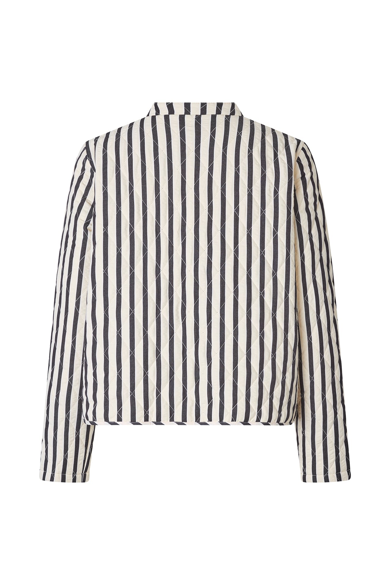 De Emilia Jacket LS in Stripe van Lollys Laundry is een licht gewatteerde jas met klassieke zwart-witte strepen. Het ontwerp combineert een ontspannen pasvorm met verfijnde details, waardoor het een veelzijdige keuze is voor zowel casual als elegante outfits.